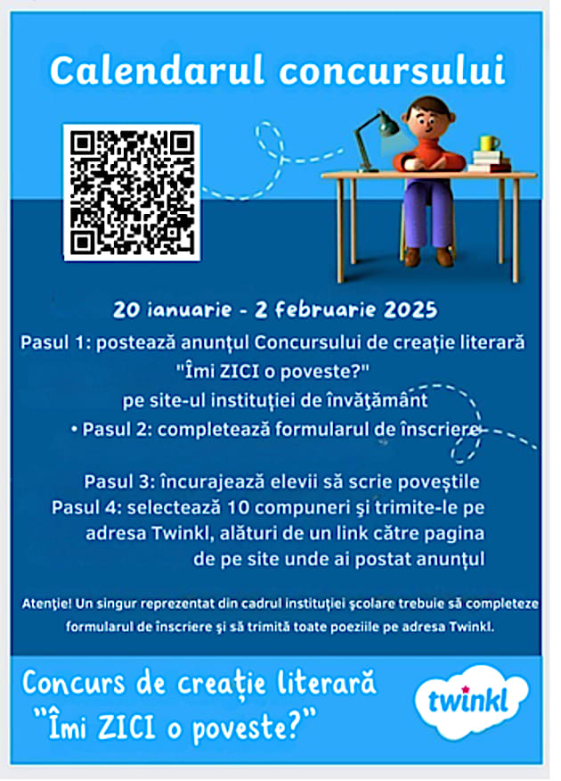 Editura internațională Twinkl organizează concursul de creație literară „Îmi ZICI o poveste?” pentru a marca Ziua Internațională a Cititului Împreună 2025. Concursul este deschis elevilor din clasele I-VIII și invită tinerii scriitori să creeze povești originale pornind de la teme special adaptate pentru fiecare categorie de vârstă. Cele mai creative povești vor fi publicate în trei cărți digitale și distribuite în întreaga comunitate Twinkl. Pentru înscriere și detalii complete vizitați pagina concursului.